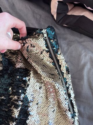 Falda con lentejuelas reversibles que cambian de verde a plateado. Tiene una abertura lateral. - Diseño de lentejuelas. - Abertura lateral.