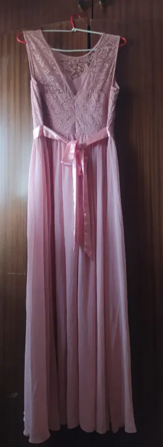 Elegante vestido largo de fiesta. - Diseño sin mangas. - Cuerpo de encaje. - Cinturón de satén. - Falda fluida.