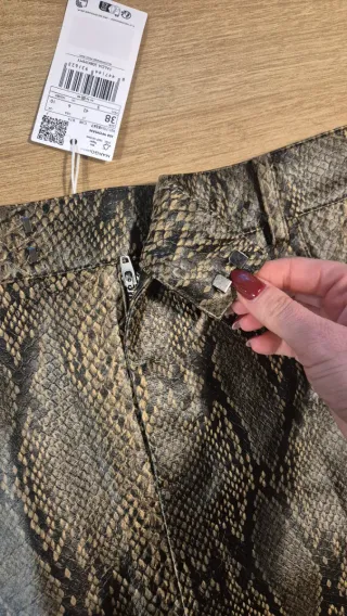 Minifalda con un llamativo estampado de serpiente y acabado efecto piel. - Diseño moderno y atrevido. - Cintura con trabillas para cinturón. Efecto piel de serpiente. Tiro medio. Diseño corto. Diseño recto. Dos bolsillos laterales. Trabillas. Cierre delantero de cremallera y botón. Con etiqueta 🏷 En perfecto estado Color beig