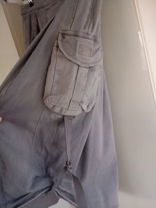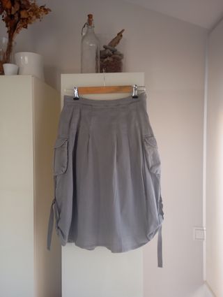 Falda midi de estilo cargo de Adolfo Domínguez. - Diseño midi. - Bolsillos cargo. - Lazos ajustables en los laterales. Falda midi en muy buen estado. Muy original. Bolsillos cargo. Totalmente forrado con tela de mini flores a tono.
