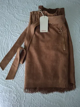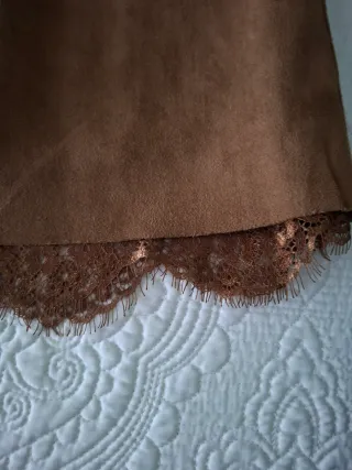 Mini falda de antelina en color marrón, con detalles dorados. Largo 47 cm - Cintura elástica, con cinturón en antelina. - Bolsillos laterales con cremalleras doradas. - Forrada en el interior con forro marrón. - El forro acaba en un precioso bajo con detalle de encaje.