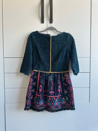 Vestido corto con un diseño llamativo y moderno. La parte superior es de un tejido suave y texturizado, mientras que la falda presenta un estampado geométrico vibrante. Puesto queda monísimo. - Tejido superior con textura. - Falda con estampado geométrico. - Detalle de hilo dorado en la cintura. - Bajo con flecos.