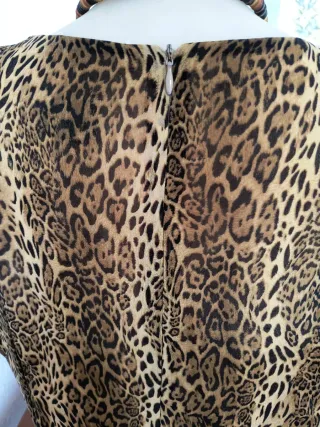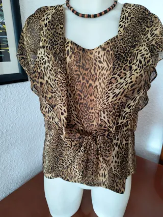 Elegante conjunto de blusa y falda con estampado de leopardo. Todo forrado. - Blusa con mangas cortas y escote cuadrado y con detalle de lazada en la cintura. - Tejido ligero y fluido. - Falda con volante en el bajo. - Cierre con cremallera en las dos piezas