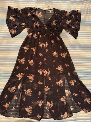 Vestido largo con estampado floral en tonos negros y rosas. Presenta un diseño vaporoso y elegante. - Mangas acampanadas. - Escote en V. - Aberturas laterales en la falda. - Cierre de botones en la parte frontal.