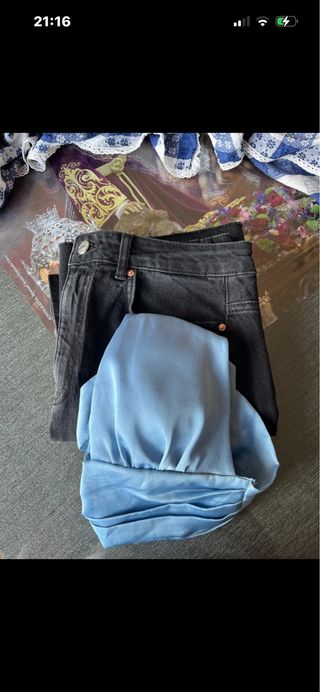 Conjunto de falda, top y bolso. - Falda de Stradivarius. - Top elegante de color azul. - Bolso a juego azul.