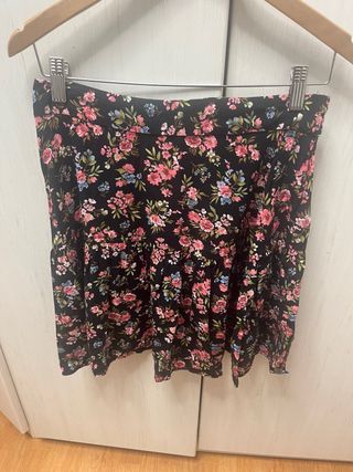 Mini falda con un bonito estampado floral sobre fondo negro. Es ligera y con un corte que la hace muy favorecedora. - Estampado floral multicolor. - Diseño mini. - En perfecto estado, muy poco uso. - Talla : M/38