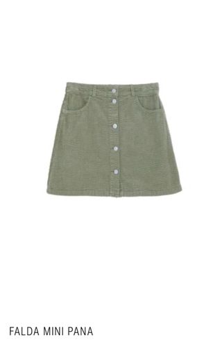 Falda corta de color verde con un diseño moderno. - Tejido liso. - Abertura lateral en el bajo. - Cintura con trabillas.