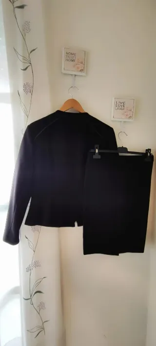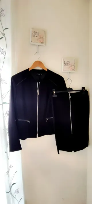 Elegante conjunto de chaqueta y falda. - Chaqueta con cremallera frontal y detalles de cremalleras en los bolsillos. - Falda con cremallera frontal.