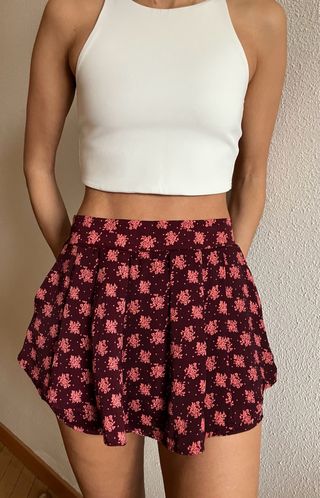 Falda corta con estampado floral. - Cintura elástica. - Diseño vaporoso y ligero. - Estampado de flores en tonos rosas y burdeos.