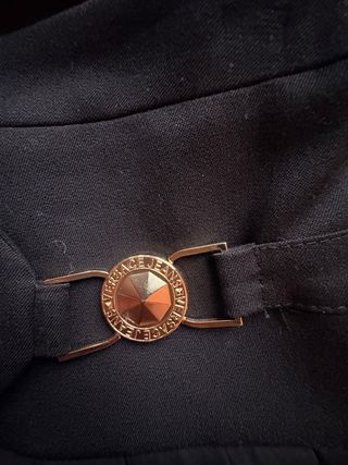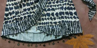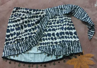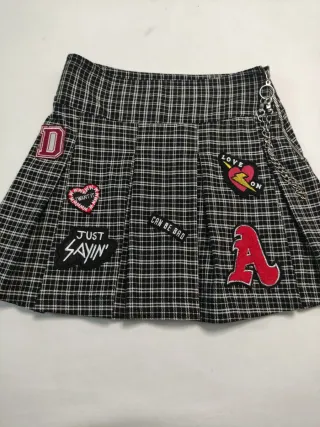 Falda mini cruzada con un diseño llamativo y detalles de monedas. - Estampado único en negro y blanco. - Adornada con pequeñas monedas metálicas en el bajo. - Diseño cruzado con cierre. - Talla S
