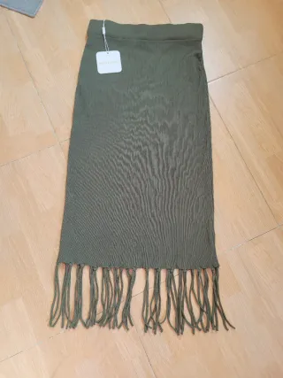 Falda de punto elástico con un diseño moderno y detalles de flecos en el bajo. Su tejido se adapta cómodamente.70 cm de largo más los flecos - Diseño de punto acanalado. - Flecos decorativos en el dobladillo.