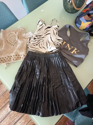 Conjunto de falda y tres tops. - Falda plisada de efecto piel. - Top con estampado de cebra ZARA - Top deportivo gris con letras doradas. - Top de punto dorado