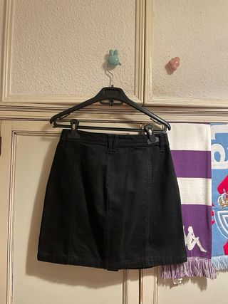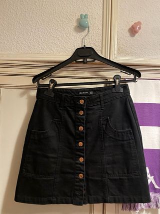 Falda vaquera negra de Stradivarius. - Diseño de botones frontales. - Bolsillos delanteros. - Corte A.