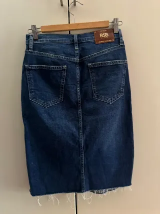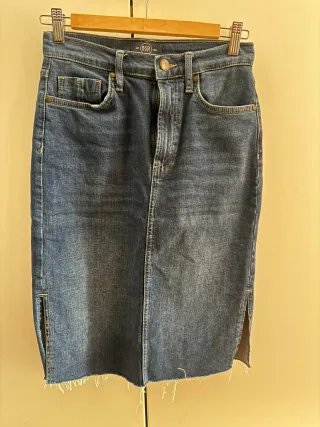 Falda midi de corte recto en tejido vaquero. Presenta un diseño moderno con bajo deshilachado y aberturas laterales. - Tiro medio. - Cierre de cremallera y botón. - Bolsillos delanteros y traseros.