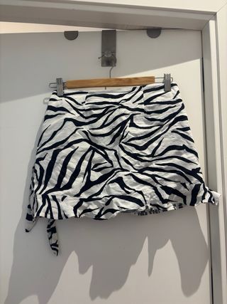 Falda corta con un llamativo estampado de cebra. Su diseño envolvente y el detalle de volantes en el bajo le dan un toque moderno y femenino. - Estampado de cebra en blanco y negro. - Diseño envolvente con lazada lateral. - Bajo con volante.