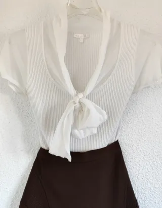 Elegante conjunto de dos piezas. - Blusa blanca con detalle de lazo. - Falda marrón con detalles de pespuntes en relieve. - Con un diseño estratégico.