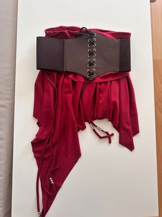 Conjunto de disfraz de pirata con un diseño llamativo. - Corsé de estilo marrón con cordones. - Falda roja con volantes y cordones decorativos.
