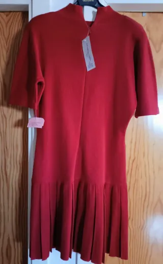 Vestido de punto en color rojo, con un diseño elegante y moderno. - Manga corta. - Cuello alto. - Falda plisadasisa 55cm y largo 93cm