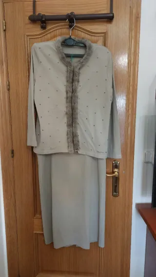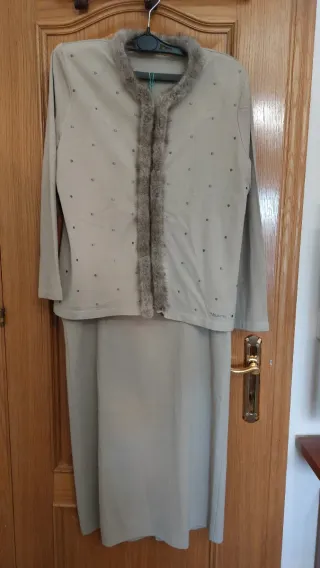 Elegante conjunto de falda y chaqueta de la marca Naulover. - Chaqueta con detalles bordados - Falda larga a juego. - Color beige con detalles en gris.