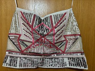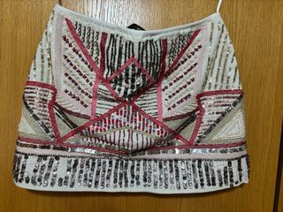 Falda corta con un diseño geométrico y mucho brillo. Ideal para eventos especiales. - Adornada con pedrería y lentejuelas. - Base de tela blanca. - Diseño multicolor, principalmente escala de rosados y plata. - En las fotos se puede apreciar zonas con perdida de adornos, y tiene una pequeña mancha que no sale, pero no se aprecia puesta