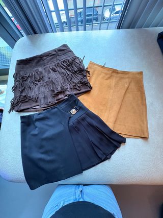 Conjunto de tres faldas con diferentes estilos. - Falda marrón con flecos. - Falda de ante color camel. - Falda azul con plisado y detalle de broche.