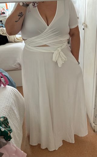 Conjunto de top y falda larga con bolsillos y coma en la cintura para mayor sujeción. Tejido elástico. El top es ajustable ya que se anuda en el pecho. ¡¡¡PRECIO NO NEGOCIABLE!!!