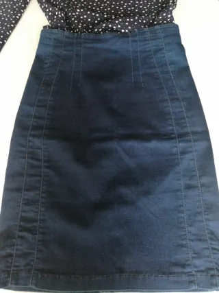 Falda vaquera de corte clásico. - Diseño de cinco bolsillos. - Cierre de botón y cremallera. - Costuras a contraste.