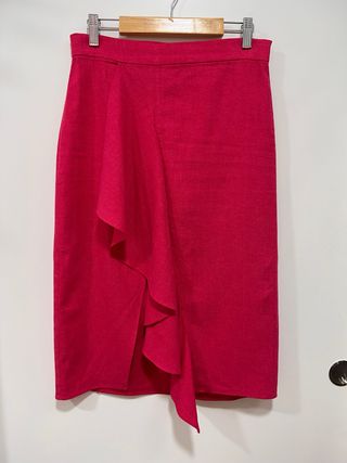 🌺Preciosa falda midi de ZARA, talla S, en color fucsia/frambuesa intenso 🌺, muy favorecedor y perfecto para primavera-verano o eventos. Diseño recto con detalle de volante frontal en cascada que aporta movimiento y un toque elegante. Cintura estructurada, cierre con cremallera trasera y tejido ligero con textura tipo lino (mezcla de 55% lino y 45% viscosa), fresca y cómoda. En perfecto estado, usada en una ocasión en un bautizo ✨ Medidas 📏 • Cintura: 35 cm • Largo: 65 cm Pregúntame cualquier duda sin compromiso!🥰