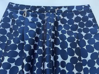 Falda de la marca Daniella con un diseño de círculos en azul y blanco. - Diseño de círculos. - Cintura con detalle metálico.