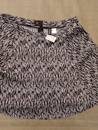 Falda de mujer talla 40 marca desigual sin uso Falda de mujer con un diseño geométrico y detalles bordados. - Estampado llamativo en blanco y negro. - Bolsillos delanteros con botones. - Adornos florales y circulares. - Bajo con vuelo. Falda de mujer talla 40 marca desigual sin uso
