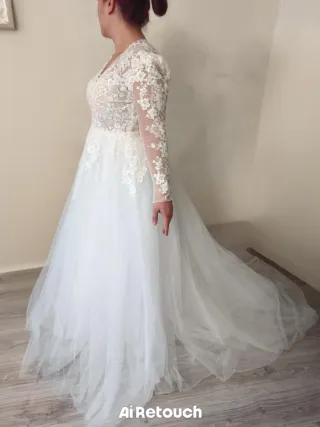 Elegante vestido de novia con detalles de encaje. Talla L/Xl - Cuerpo de encaje con manga larga. - Falda voluminosa de tul. - Escote en V.