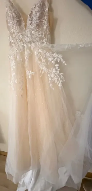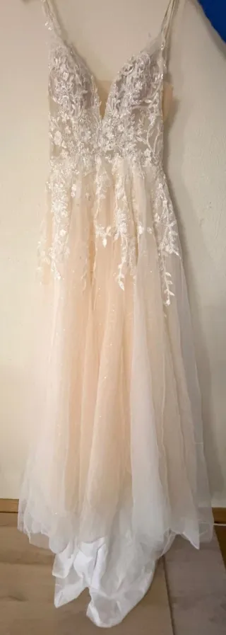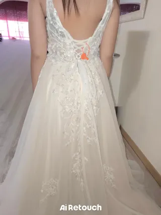 Elegante vestido de novia con detalles de encaje.tqlla S/M más M - Diseño con tirantes finos. - Cuerpo de encaje con escote pronunciado. - Falda voluminosa de tul.