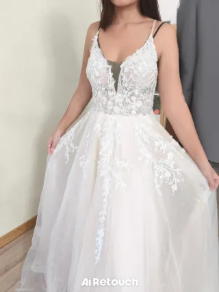 Elegante vestido de novia con detalles de encaje y pedrería.Talla S/M - Diseño con tirantes finos. - Cuerpo con escote pronunciado. - Falda vaporosa de tul. - Adornos florales y brillantes.