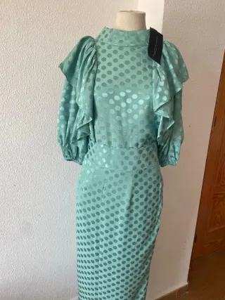 Conjunto de dos piezas de Matilde Cano, ideal para ocasiones especiales. - Diseño elegante y moderno. - Falda larga con abertura. - Mangas abullonadas. - Cierre con botones en la espalda. - Etiqueta original incluida.