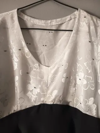 Vestido con parte superior blanca de encaje/lentejuelas y falda negra lisa. Escote en V. Muy favorecedor para cenas o eventos nocturnos. Talla L/40