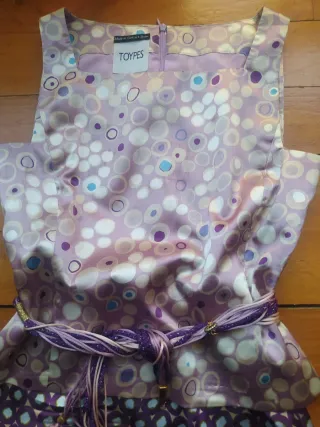 Conjunto de dos piezas: un top de la marca TOYPES y una falda de Pedro del Hierro. El top presenta un estampado de círculos en tonos lilas y blancos, con detalles en azul. La falda es de color morado oscuro con un estampado geométrico de círculos en tonos claros. - Top sin mangas. - Cinturón de cordon trenzado a juego. Hacen ambos talla 38 Medidas:Top de axila a axila 47 cm. y largo 52 cm. Falda de cintura 37 cm. y largo 59 cm.