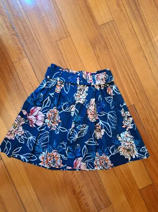 Falda corta con estampado floral sobre fondo azul marino. Presenta un cinturón a juego con hebilla redonda.cintura elastica - Diseño de cintura alta. - Estampado de flores en tonos rosas , blancos. Salmón y azul - Cinturón con detalle de anilla.