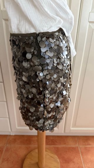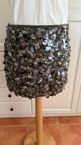 Falda corta con lentejuelas. - Diseño con lentejuelas circulares. - Cintura con banda de tela. - Acabado brillante - Lleva cremallera y va forrada