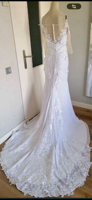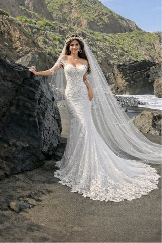 Elegante vestido de novia estilo sirena, con detalles de encaje. El precio original del vestido fue 2000 €. - Diseño con escote corazón y mangas largas. - Falda con cola y apliques de encaje floral. - Velo largo con pedrería. -se entrega lavado junto con la funda y la percha y también en el precio. Incluye el pelo, una diadema y las sandalias.
