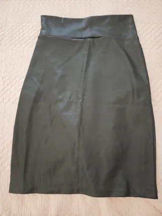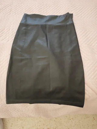 Falda de cuero sintético en color negro. - Diseño liso. - Cintura alta. - Largo hasta la rodilla.