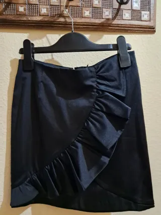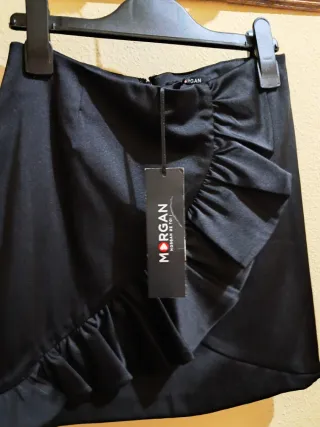 Elegante falda negra de la marca Morgan, ideal para vestir. Presenta un diseño con volantes que le dan un toque especial. - Diseño cruzado con volantes. - Cremallera lateral para cierre.