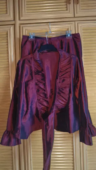 Elegante conjunto de falda y blusa en color burdeos. La blusa tiene volantes y mangas acampanadas. Se ha usado en una ocasión, para un evento. - Tejido satinado. - Blusa con lazada. - Mangas con volantes.