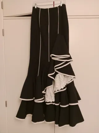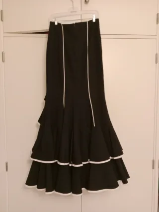 Falda larga de estilo flamenco, con un diseño elegante y llamativo. - Diseño con volantes escalonados. - Detalles de puntilla blanca. - Ribetes blancos en los bordes.