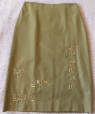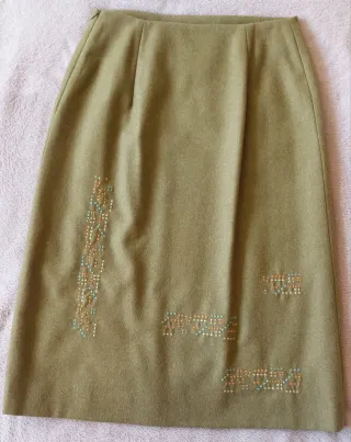 Falda recta de Adolfo Dominguez en un bonito tono verde oliva. Presenta un diseño con aplicaciones. Tejido 75% lana. - Diseño recto. - Aplicaciones bordadas. - Totalmente forrada