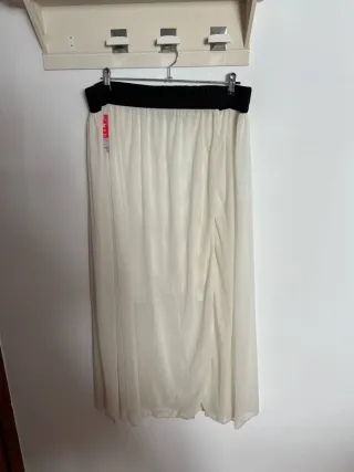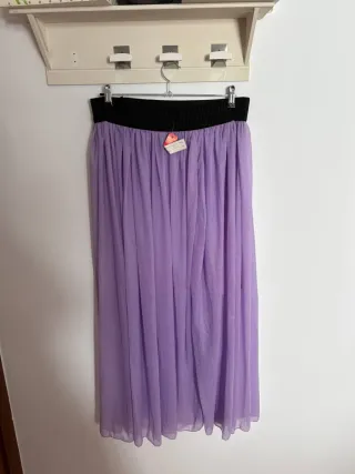 Falda larga y fluida con un diseño elegante. - Cinturilla elástica negra. - Tejido ligero y vaporoso. - Detalle de abertura lateral.
