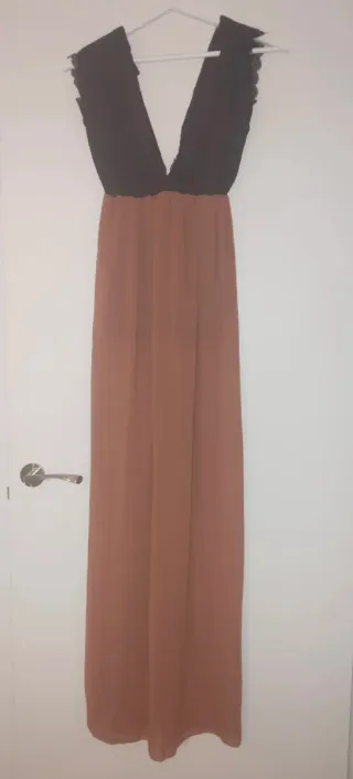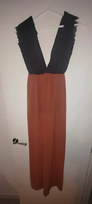 Elegante vestido largo con detalles de encaje en la parte superior. - Diseño con escote pronunciado. - Combinación de colores negro y teja. - Corte maxi. - Tiene forro en la parte del pecho, en la parte de la falda no. - caída suave y elegante , es una auténtica fantasía.
