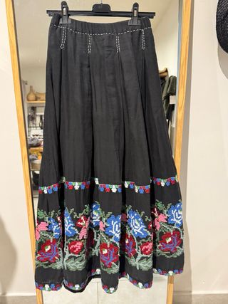 Falda larga con un diseño único y llamativo. - Cintura con detalle de pespuntes blancos. - Amplio vuelo. - Base negra con bordado floral multicolor. - Estilo Kalami Rumi.