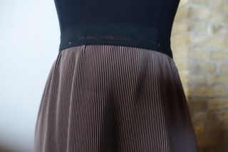 Falda con un diseño plisado elegante. - Cintura elástica negra. - Falda de color marrón. - Tejido con textura acanalada. -Hecha a mano.