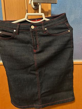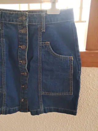 Falda vaquera de corte moderno con botones. - Diseño con bolsillos delanteros. - Cierre de botones en la parte frontal. - Costuras visibles que realzan el diseño. - Muy poco usada.