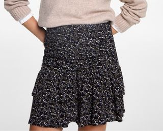 Falda corta con estampado floral sobre fondo negro. Presenta un diseño fruncido en la cintura y volantes. - Estampado floral. - Cintura fruncida. - Volantes en el bajo.